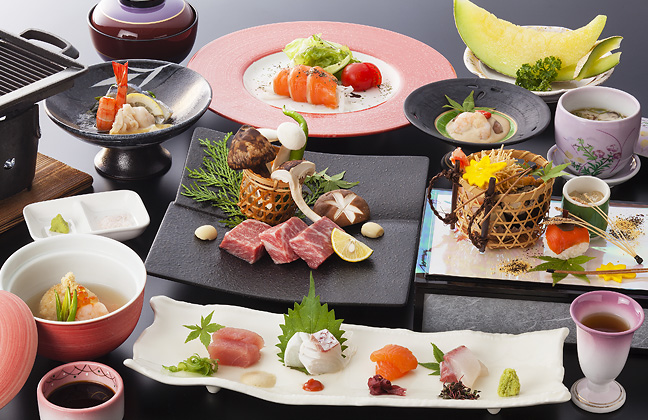 1 黒毛和牛ステーキ 2 海の幸 宝楽焼 3 津山黒豚の蓮の葉蒸し ※ お一人づつ別々の料理をお選び頂いても結構です