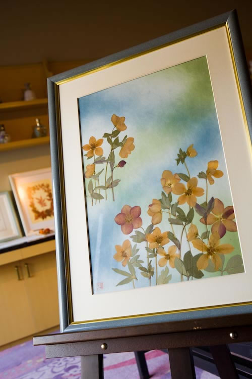 ロビーの押し花ギャラリー前に小さなスペースですが、お子様用のオモチャや本を置いています。お気軽にご利用ください。