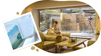 ロビーからは中庭や滝が見渡せ落着いたとってもいいムード。BGMは身体に優しい波動、快い音色でとっても落着きます。