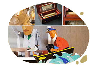 世界のオルゴールが展示され、歴史あるオルゴールの音色にうっとり。木製手作りのユーモラスな人形、精密な木製歯車などもあり楽しくて時間を忘れそう。
